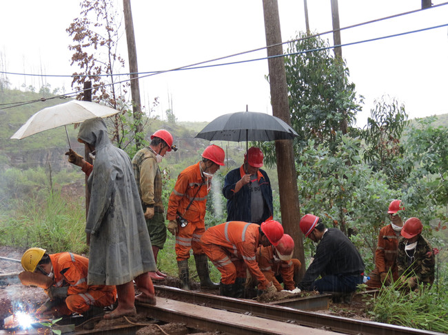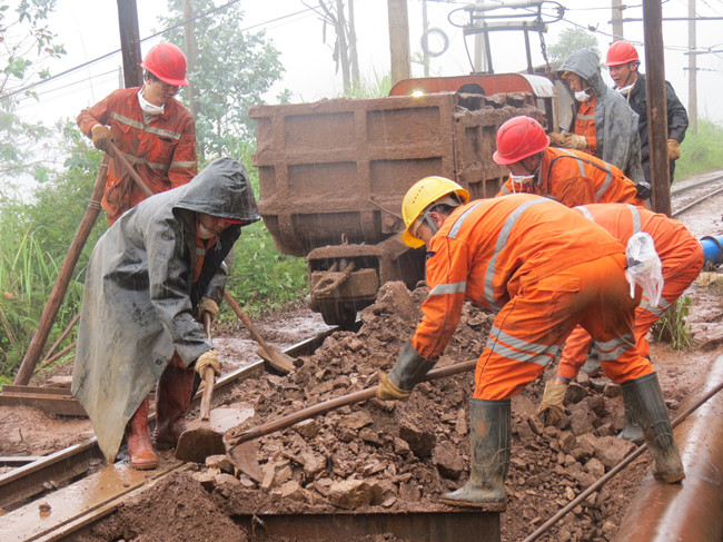老廠分公司紅塘子鐵道運輸線路是馬鹿塘坑出礦的主要運輸線路,承擔著80%的礦量運輸任務。8月3日,由于連續多日強降雨,老廠分公司紅塘子鐵道運輸線路段出現局部陷落問題,運輸線路生產受阻。對此,敢打硬仗的馬坑干部職工在洪災面前不氣餒,困難面前不低頭,以泰山壓頂不彎腰的氣魄與暴雨奮力搏斗,經受住了一場特殊的考驗,譜寫了一曲“狂風暴雪何所懼,奮力抗災保生產”的樂章。