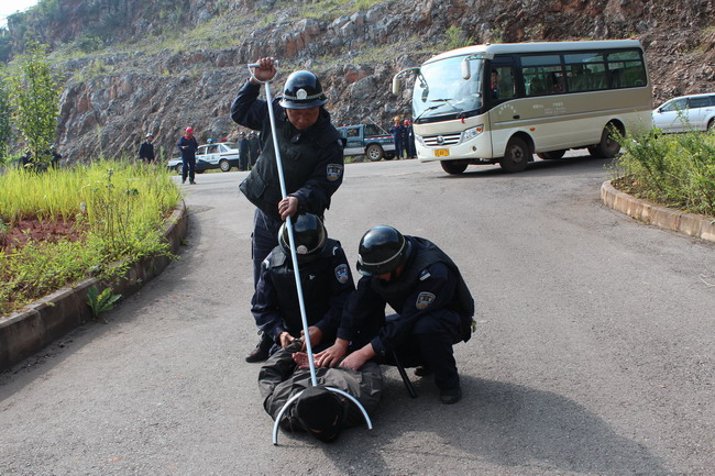 演練設置為早上9點30分左右,在通勤車乘坐點,一群身份不明的人員在職工乘坐通勤車下班時進行突然襲擊,對車間設施進行破壞,其中3名“暴恐分子”在中巴車內挾持了3名職工,守護精選工段的保衛人員接到報警后,兩名保衛人員立即對恐怖分子進行阻擊,另外一名保衛人員立即把情況上報給反恐小組辦公室,反恐領導小組迅速啟動應急方案。