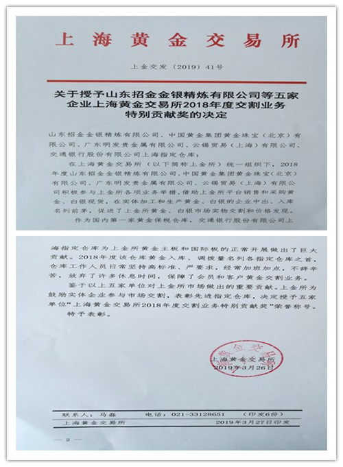 據悉,上海金交所是國內第一家黃金保稅倉庫,此次“特別貢獻獎”是上金所為鼓勵實體加工和生產黃金、白銀企業積極參與實體交割等業務,對平臺采購、銷售業務名列前茅的單位給予的表彰。