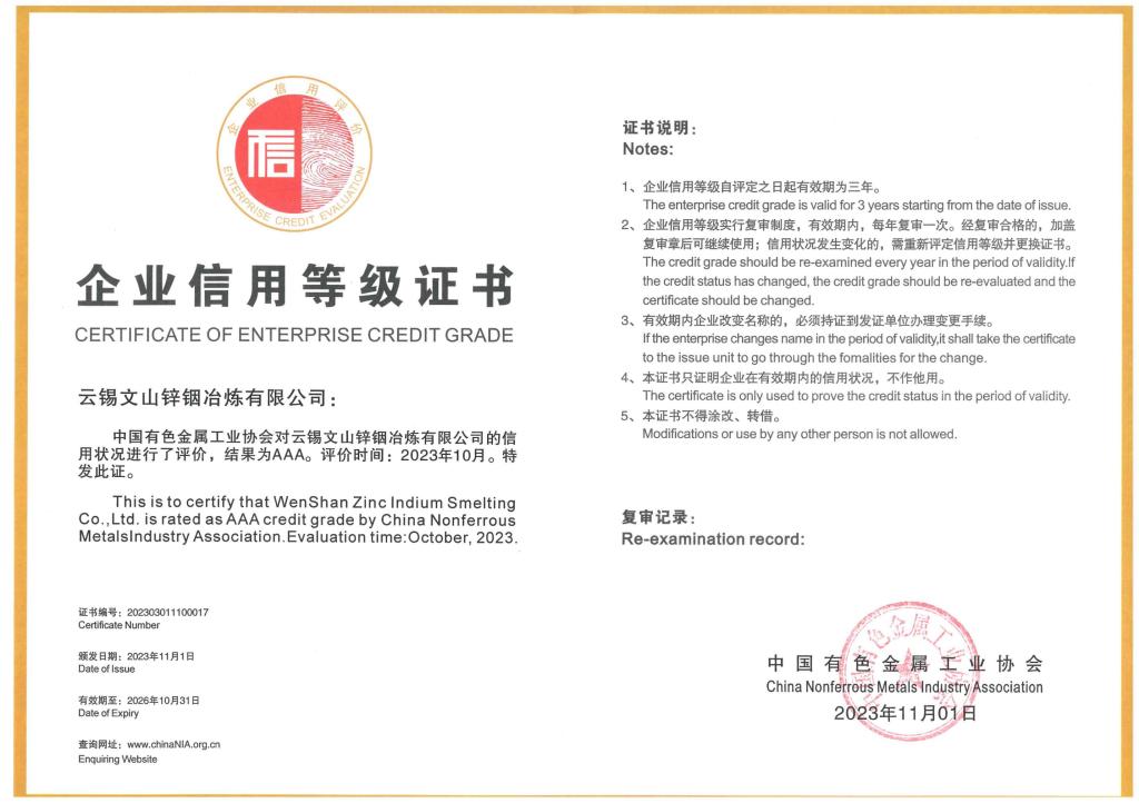 文山鋅銦公司牢固樹立誠信經營意識,始終將信用體系建設放在首要位置,建立健全科學完善的信用管理體系,強化對上下游客戶的資信管理,全面推行產品質量管理,建立并完善生產、銷售、服務等各個環節的標準,為公司在激烈的市場競爭中提供強有力的支撐。曾獲得“國家級綠色工廠”、“高新技術企業”“云南省企業技術中心”等多項榮譽,切實用高質量的產品品質和服務詮釋公司實力。